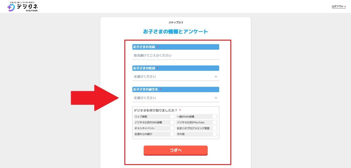 お子さまの名前、お子さまの性別、お子さまの誕生年とデジタネを知ったきっかけのアンケートを入力します。