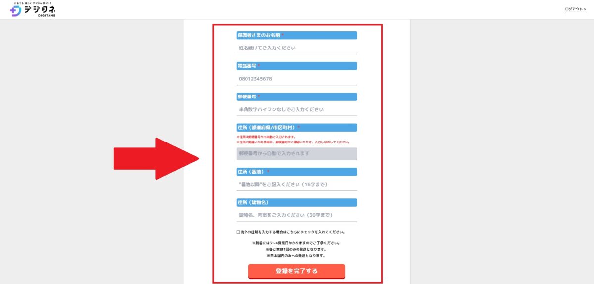 郵送の手配のために保護者情報を入力する必要がありますので間違いの無いように入力してください。