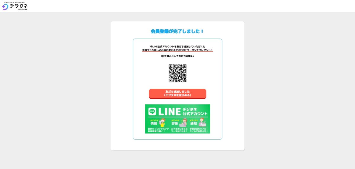 デジタネの公式LINEを友だち追加すると有料プラン申込時に使える250円OFFクーポンが発行されます。