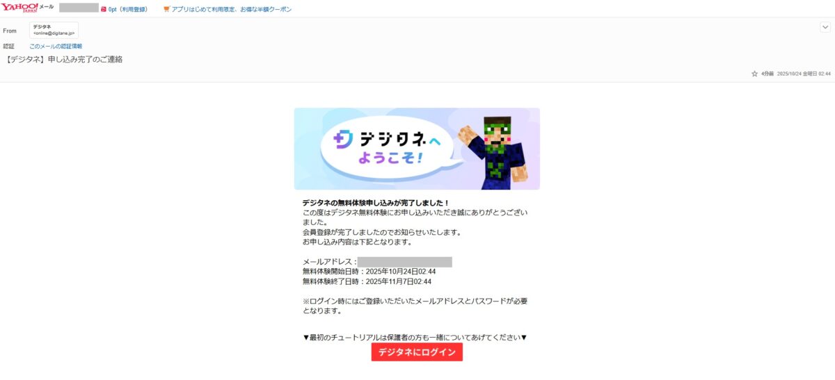 無料体験申込みが完了している場合は登録したメールアドレス宛てに上記の画像のメールが届きます。