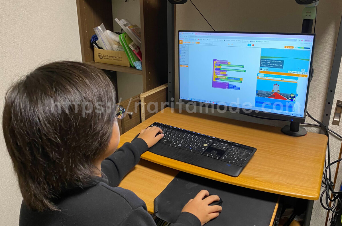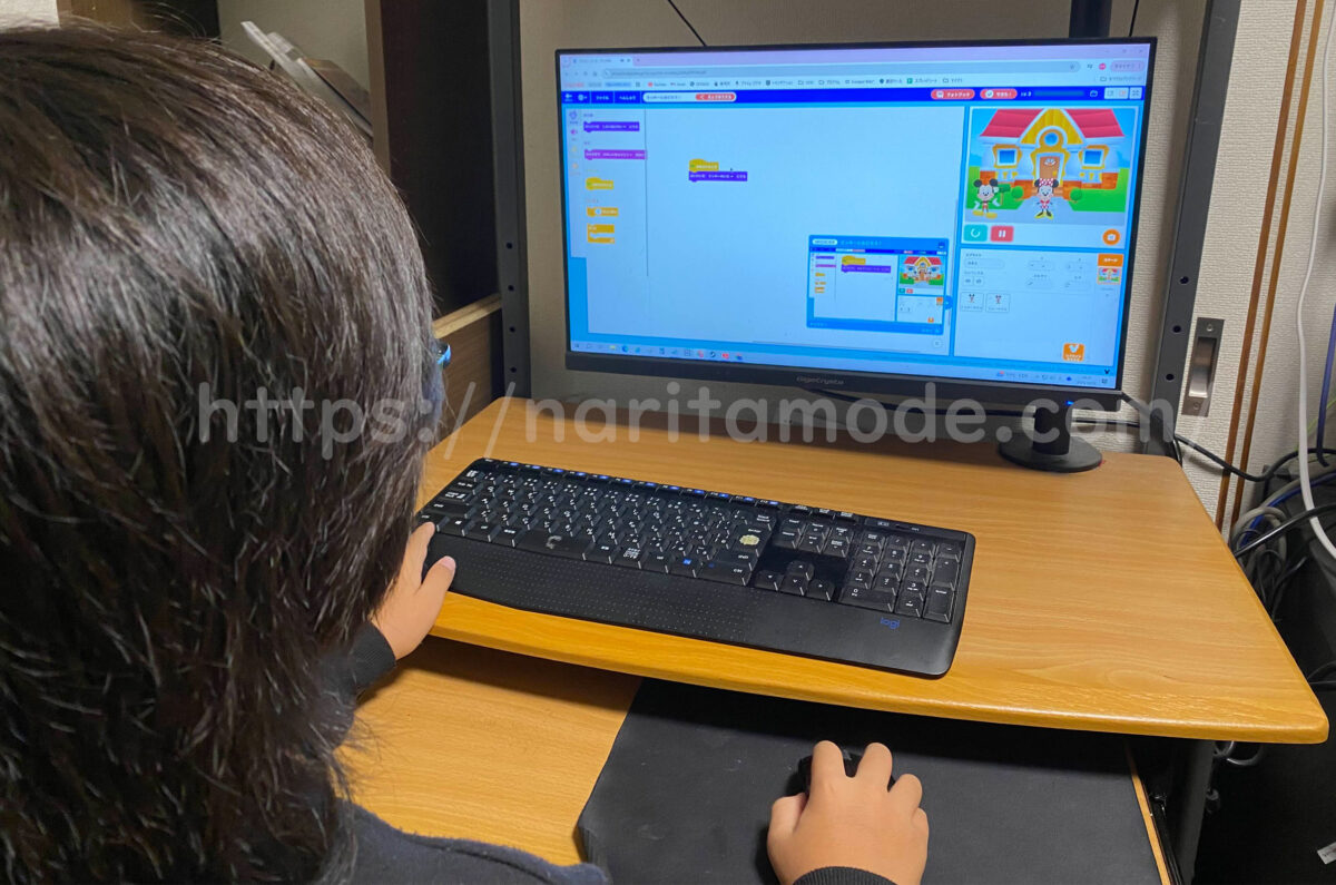 息子はスクラッチ自体は小学校の授業でも扱ったことがあるので手慣れた様子で指示通りにプログラミングをしていました。
